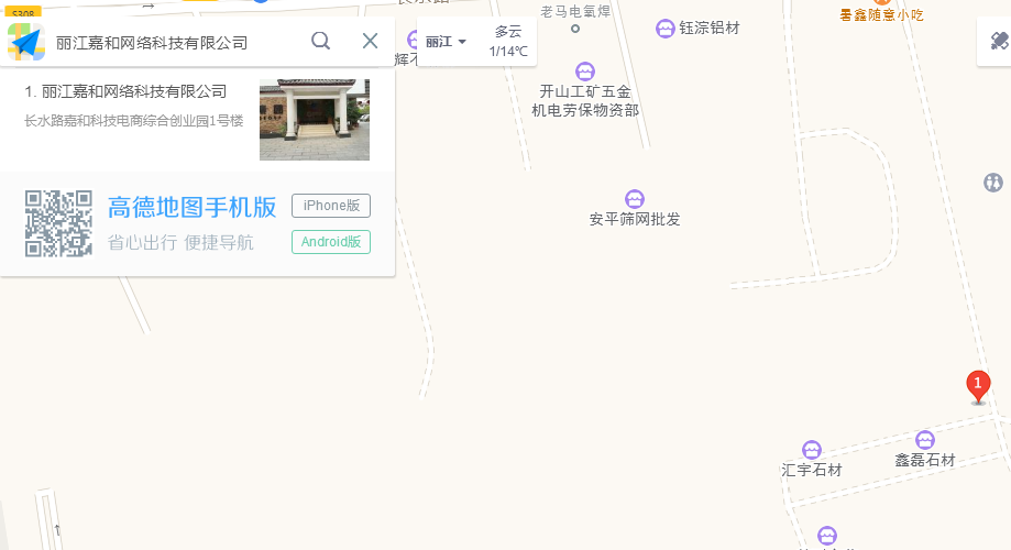 方式二:通過高德地圖搜索關(guān)鍵字:“麗江嘉和網(wǎng)絡(luò)科技有限公司”找到我公司。