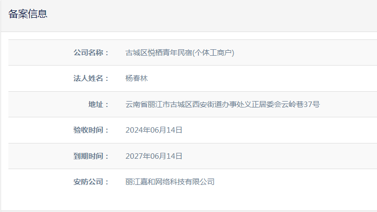 關(guān)于古城區(qū)悅棲青年民宿(個體工商戶)電子監(jiān)控安防合格證下證通知