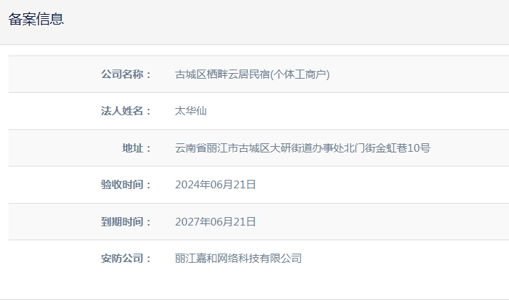 關(guān)于古城區(qū)棲畔云居民宿(個體工商戶)電子監(jiān)控安防合格證下證通知
