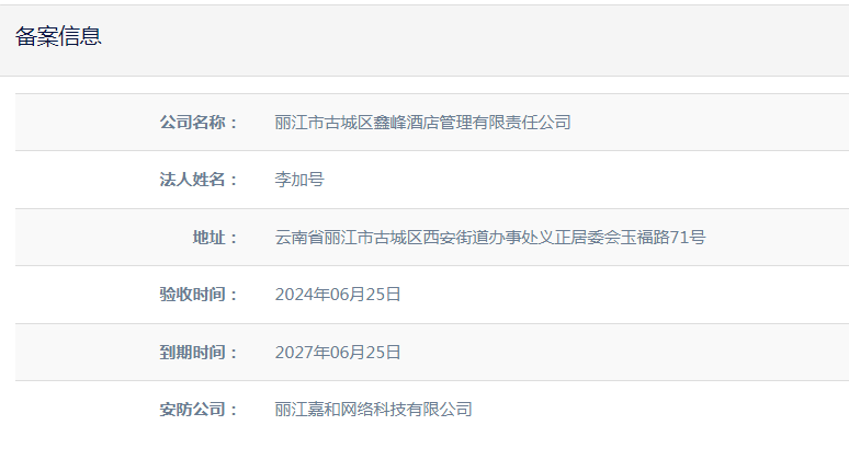 關(guān)于麗江和府酒店有限公司英迪格酒店電子監(jiān)控安防合格證下證通知