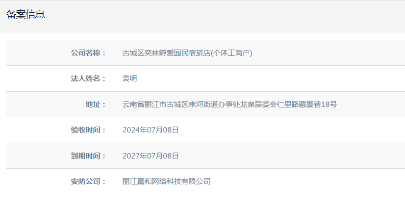 關(guān)于古城區(qū)奕林孵愛(ài)園民宿旅店(個(gè)體工商戶)電子監(jiān)控安防合格證下證通知