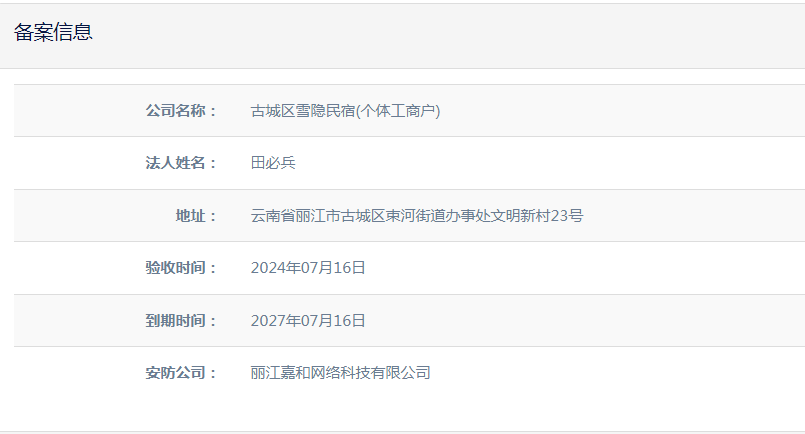 關(guān)于古城區(qū)雪隱民宿(個(gè)體工商戶)電子監(jiān)控安防合格證下證通知