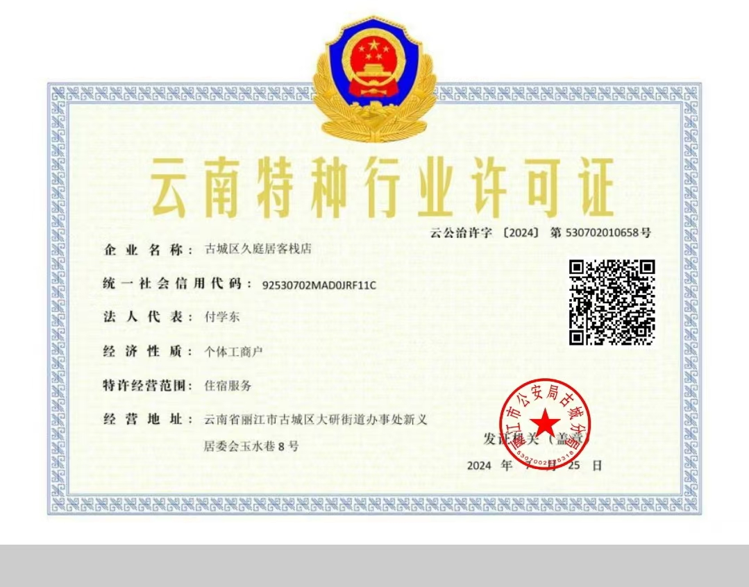 關(guān)于古城區(qū)久庭居客棧店電子特種行業(yè)許可證下證通知