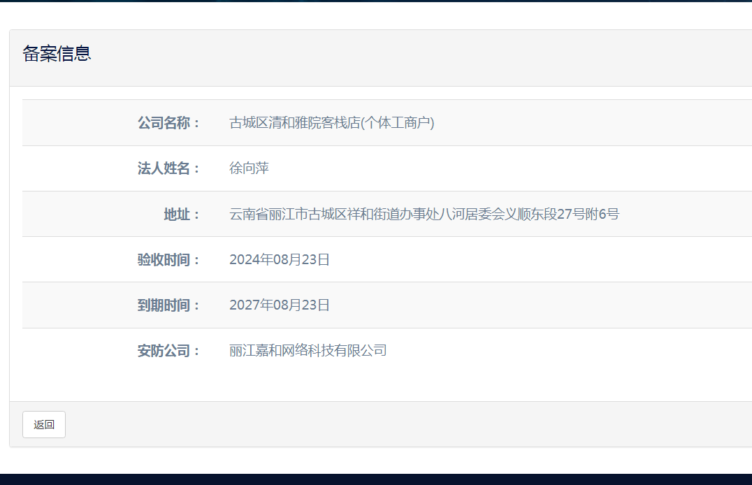 關(guān)于古城區(qū)清和雅院客棧店(個體工商戶)電子監(jiān)控安防合格證下證通知