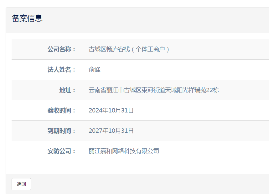 關于古城區(qū)暢廬客棧(個體工商戶)電子監(jiān)控安防合格證下證通知
