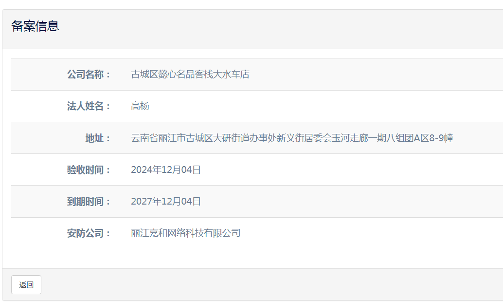 關(guān)于古城區(qū)懿心名品客棧大水車店電子監(jiān)控安防合格證下證通知