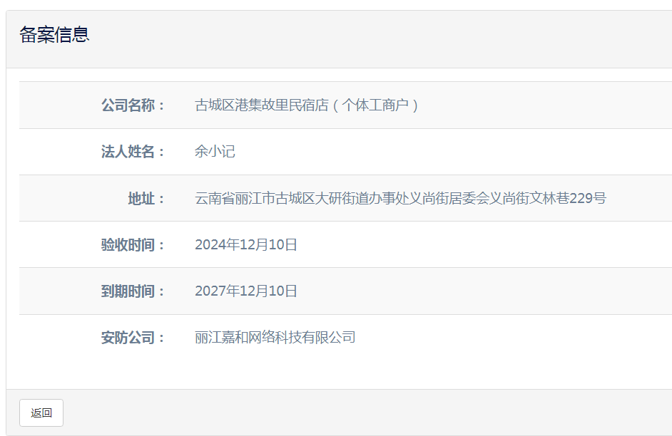 關(guān)于古城區(qū)港集故里民宿店(個體工商戶)電子監(jiān)控安防合格證下證通知