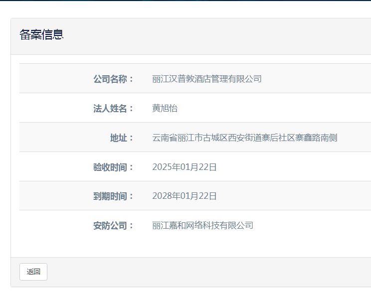 關(guān)于麗江漢普敦酒店管理有限公司電子監(jiān)控安防合格證下證通知