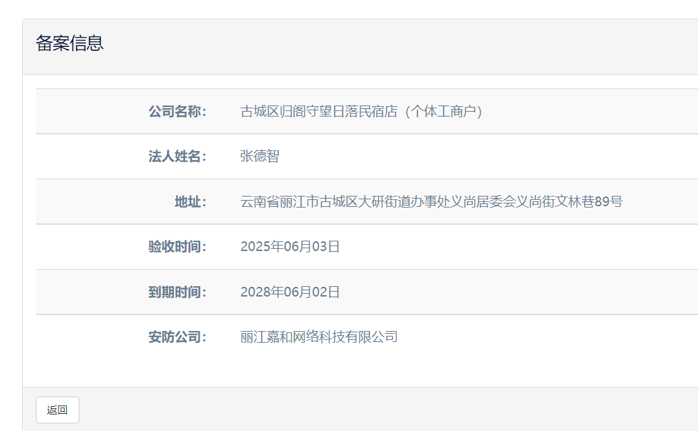 關(guān)于古城區(qū)歸閣守望日落民宿店(個體工商戶)電子監(jiān)控安防合格證下證通知