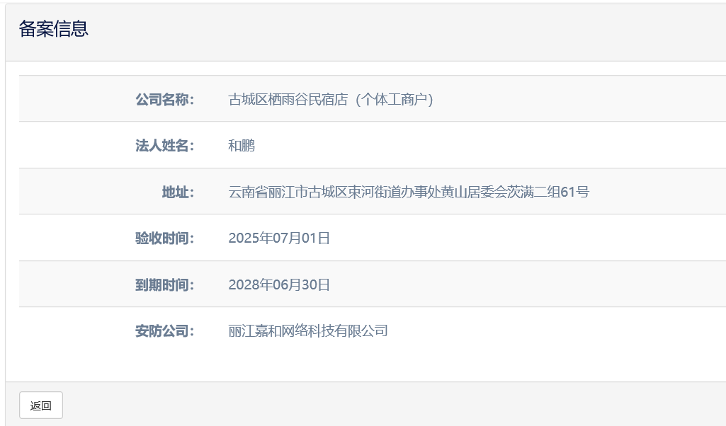 關(guān)于古城區(qū)棲雨谷民宿店(個體工商戶)電子監(jiān)控安防合格證下證通知