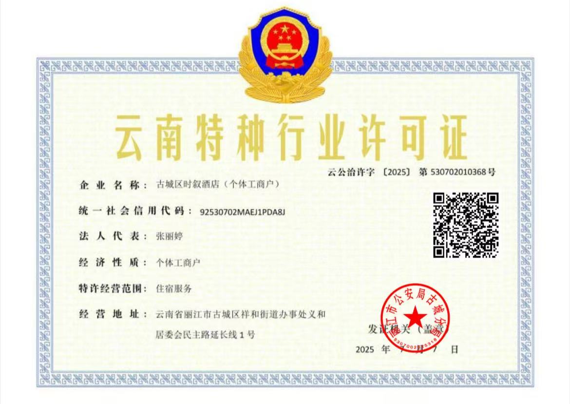 關(guān)于古城區(qū)時(shí)敘酒店(個(gè)體工商戶)電子特種行業(yè)許可證下證通知