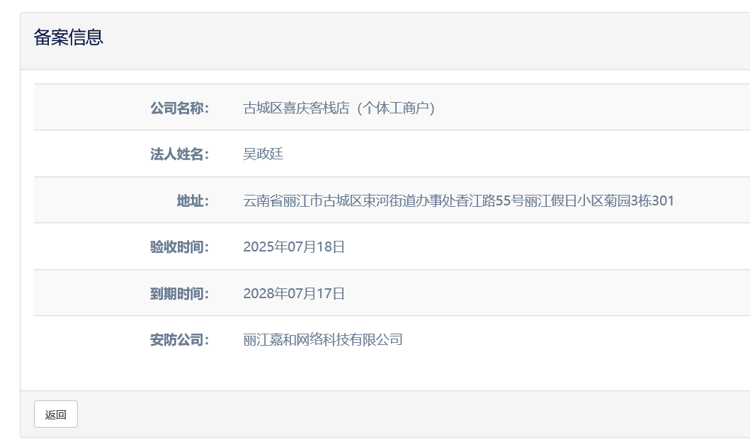 關(guān)于古城區(qū)喜慶客棧店(個體工商戶)電子監(jiān)控安防合格證下證通知