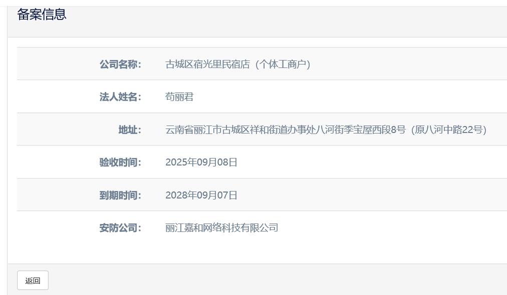 關(guān)于古城區(qū)宿光里民宿店(個體工商戶)電子監(jiān)控安防合格證下證通知